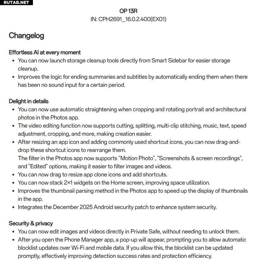 Компания OnePlus начала постепенный выпуск обновления OxygenOS 16.0.2.400 для смартфона OnePlus 13R. Обновление с номером сборки CPH2691_16.0.2.400 распространяется партиями и приносит ряд улучшений, включая доработку ИИ-функций, расширенные инструменты для редактирования фото и видео, новые возможности настройки главного экрана, улучшения системной безопасности и упрощённый процесс отправки отчётов об ошибках.