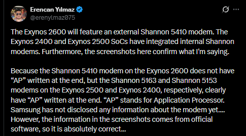 Инсайдер Эренджан Йылмаз заявил, что Exynos 2600 не включает в себя интегрированный сотовый модем. Вместо этого, как утверждается, он полагается на отдельный модем, которым, как полагают, станет Exynos 5410. Официальный представитель Samsung Semiconductor уже подтвердил изданию Android Authority, что чип на базе 2-нанометрового техпроцесса действительно использует внешний модем.