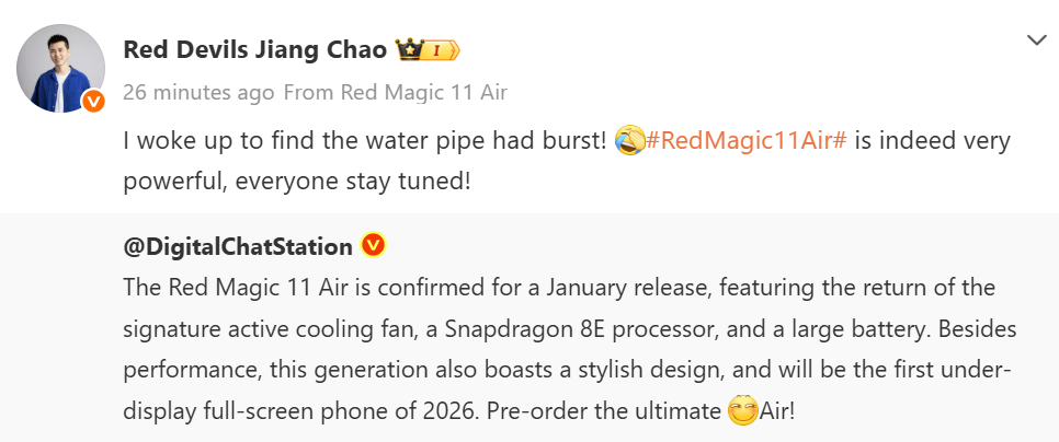 Как видно выше, известный инсайдер Digital Chat Station заявил, что Red Magic 11 Air будет представлен в Китае в январе 2026 года. Этот пост в Weibo был перепощен Чао, который отметил, что устройство действительно очень мощное.