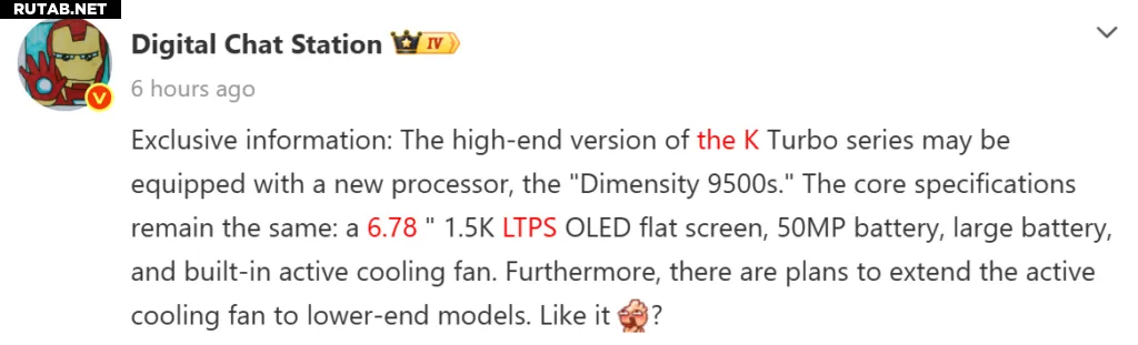 Утечка: Oppo K15 Turbo Pro получит чип Dimensity 9500s и активную систему охлаждения