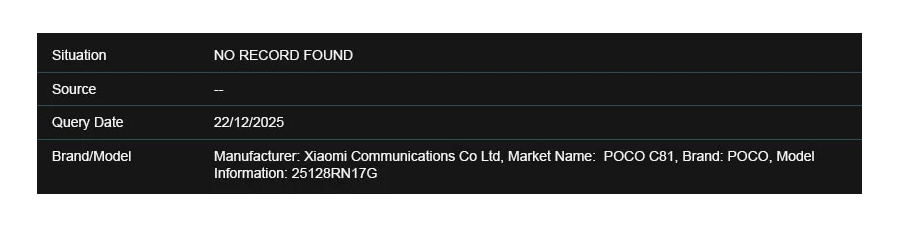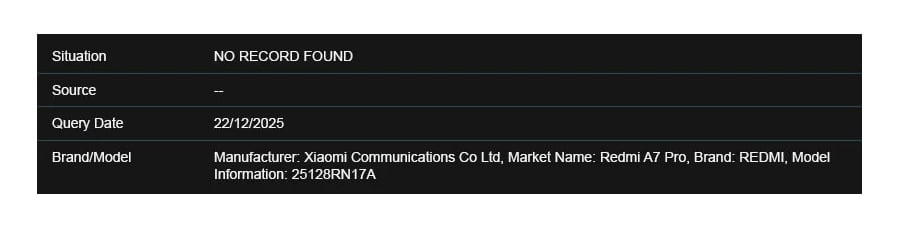 Оба устройства были замечены в базах данных GSMA IMEI и FCC, которые раскрывают большинство их ключевых характеристик. База IMEI подтверждает, что Redmi A7 Pro имеет номер модели 25128RN17A, а Poco C81 — идентификатор 25128RN17G.