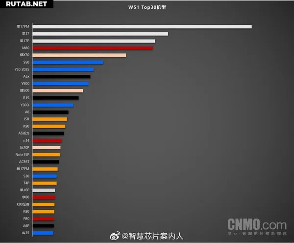 Китайский блогер, известный под ником «智慧芯片案内人», опубликовал рейтинг 30 самых продаваемых смартфонов за 51-ю неделю 2025 года.