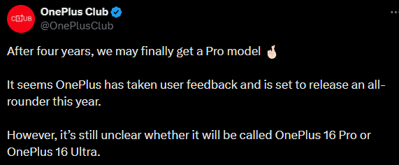 Заявление поступило от пользователя X @OnePlusClub, источника, который ранее делился информацией, связанной с OnePlus. По словам инсайдера, линейка OnePlus 16 может включать премиальный вариант, позиционируемый выше стандартной модели, с возможным окном запуска в конце 2026 года.