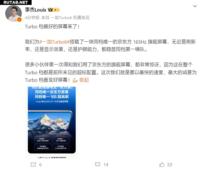 Президент OnePlus China Ли Цзе заявил, что OnePlus Turbo 6 получит единственный в своём классе флагманский дисплей от BOE с частотой обновления 165 Гц. По словам производителя, этот экран лидирует в своей категории по частоте обновления, качеству картинки и технологиям защиты зрения.