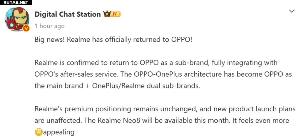 По данным аналитической компании DCS, группа Oppo теперь следует более чёткой структуре, включающей основной бренд Oppo, а также суббренды OnePlus и Realme. Полная интеграция Realme в сервисную систему Oppo является ключевой частью этого шага. Он добавил, что график запуска продуктов Realme не задерживается, и бренд должен представить Realme Neo 8 в Китае в этом месяце.
