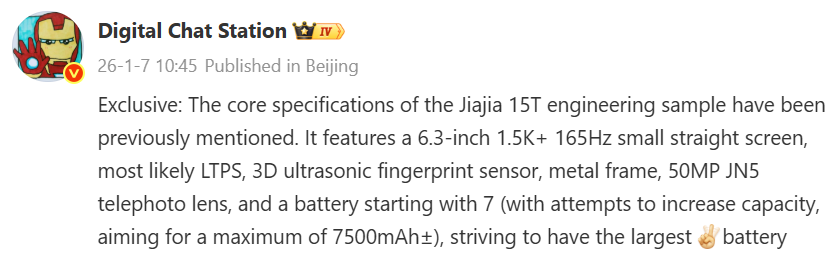 Основной изюминкой может стать аккумуляторная батарея. Сообщается, что OnePlus 15T получит аккумулятор ёмкостью около 7500 мА·ч. Ранее ходили слухи, что аппарат не будет поддерживать беспроводную зарядку. Digital Chat Station не упоминает чипсет устройства, но, согласно другим слухам, он может быть оснащён Snapdragon 8 Elite Gen 5.