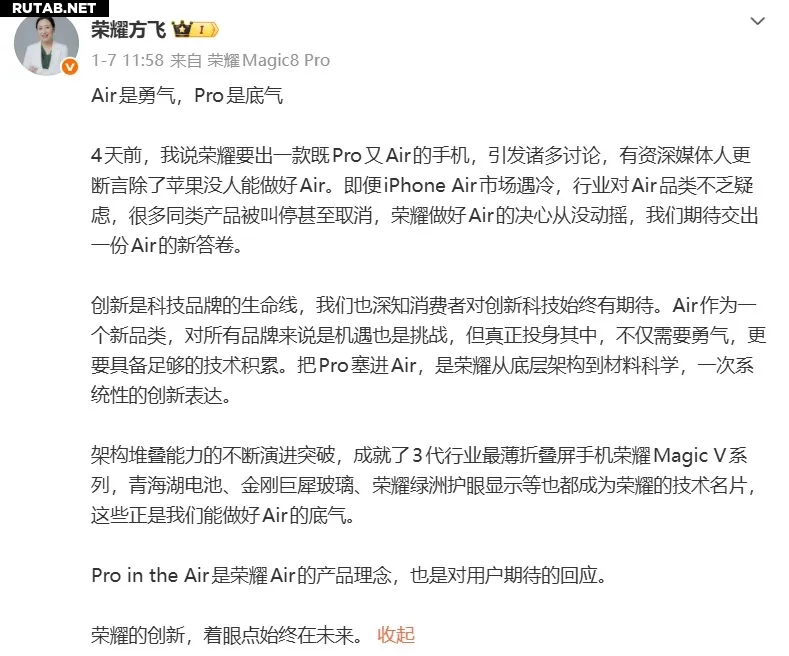 Президент продуктовой линейки компании Honor Terminal Co., Ltd. Фан Фэй заявила, что, несмотря на сомнения рынка в перспективах смартфонов класса Air и отмену или прекращение производства многих аналогичных продуктов, решимость Honor создать тонкий и мощный Air-смартфон оставалась непоколебимой. Она отметила: «Мы надеемся представить новый ответ в категории Air. Упаковать возможности Pro в корпус Air — это инновационная попытка Honor в области базовой архитектуры и материаловедения, а также ответ на ожидания пользователей».