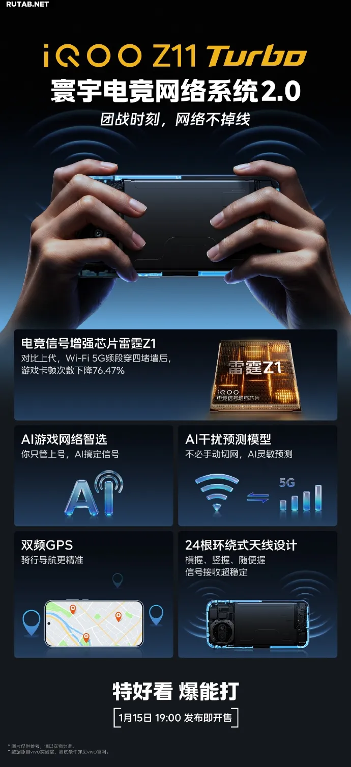 Компания iQOO анонсировала дату выхода нового смартфона Z11 Turbo. Устройство поступит в продажу 15 января. Главной особенностью новинки станет специальный игровой чип Thunder Z1 (雷霆Z1), который, по заявлениям производителя, на 76,47% снижает количество подвисаний в играх при подключении к Wi-Fi в диапазоне 5 ГГц через четыре стены.