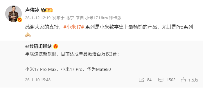 Линейка Xiaomi 17 Pro стала абсолютным лидером, преодолев планку в миллион активаций для каждой модели. Партнер Xiaomi Group Лу Вэйбин (Lu Weibing) подтвердил успех, заявив: «Серия Xiaomi 17 — самая продаваемая цифровая серия в истории Xiaomi, особенно это касается Pro-версий».