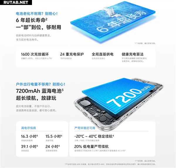 Ключевой особенностью новинки является аккумуляторная батарея. Смартфон получил встроенный аккумулятор Blue Ocean ёмкостью 7200 мАч с поддержкой быстрой зарядки мощностью 44 Вт. Производитель заявляет, что батарея сохранит свои характеристики в течение 6 лет. По данным vivo, устройство способно обеспечить до 16,3 часов непрерывной работы с экраном или 15,5 часов непрерывной навигации. Аккумулятор демонстрирует стабильную работу в диапазоне температур от -20℃ до 40℃ и поддерживает 3 часа навигации в режиме энергосбережения.