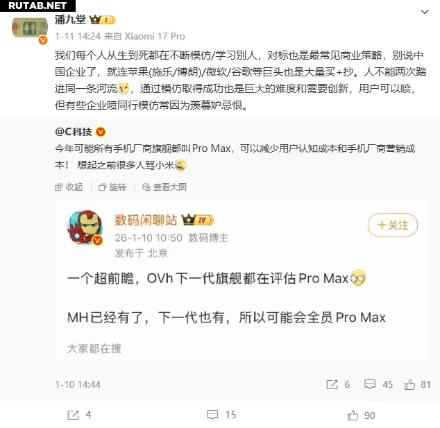 Пан Цзютан, партнер департамента промышленных инвестиций Xiaomi, высказал своё мнение в социальных сетях. Он отметил, что имитация и обучение у других — это поведение, которое сопровождает человека от рождения до смерти, а в бизнес-мире стратегия следования за лидером (benchmarking) и вовсе является обычным делом.
