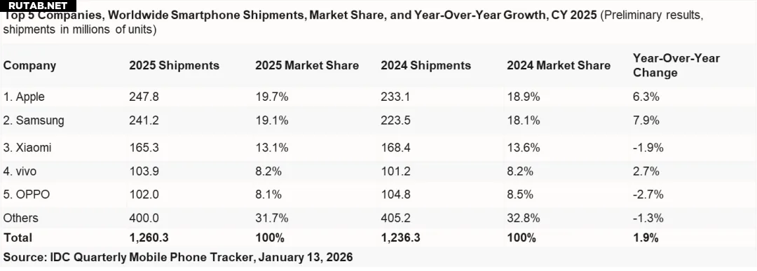 Согласно свежему отчёту аналитической компании IDC, мировой рынок смартфонов в 2025 году показал рост второй год подряд. Общий объём поставок достиг 1.26 миллиарда устройств, что на 1.9% больше, чем годом ранее.