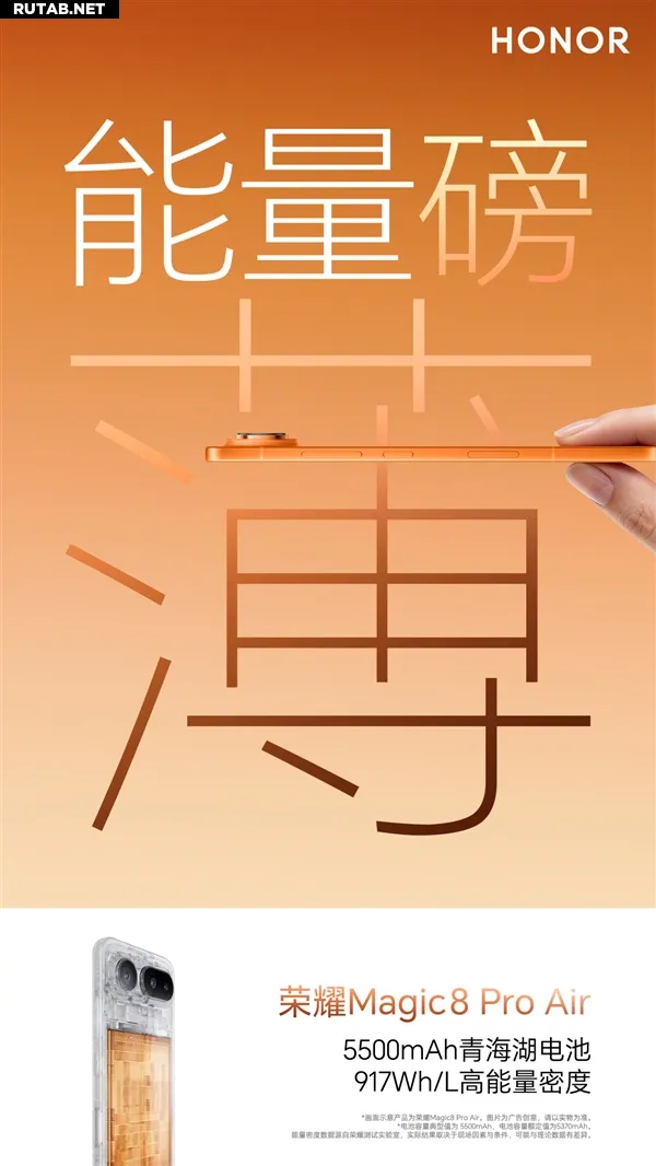 Компания Honor анонсировала, что её новый смартфон Magic8 Pro Air будет оснащён аккумулятором ёмкостью 5500 мАч с рекордной плотностью энергии в 917 Вт·ч/л. Как сообщает производитель, это «самая высокая плотность энергии среди флагманских аккумуляторов на сегодняшний день», которая «переопределит стандарты автономности для тонких и лёгких флагманов».