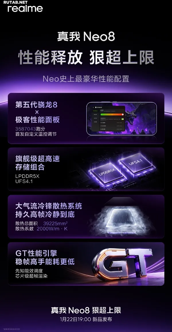 Realme Neo8 будет оснащен флагманским процессором Snapdragon 8 Gen 5, оперативной памятью LPDDR5X и накопителем UFS 4.1. В комплексных тестах производительности (AnTuTu) устройство набирает более 3,58 миллиона баллов.