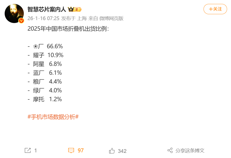 Инсайдер «Smart Chip Insider» опубликовал данные о доле поставок складных смартфонов на китайском рынке в 2025 году. Согласно информации, компания Huawei заняла первое место с впечатляющей долей в 66,6%.