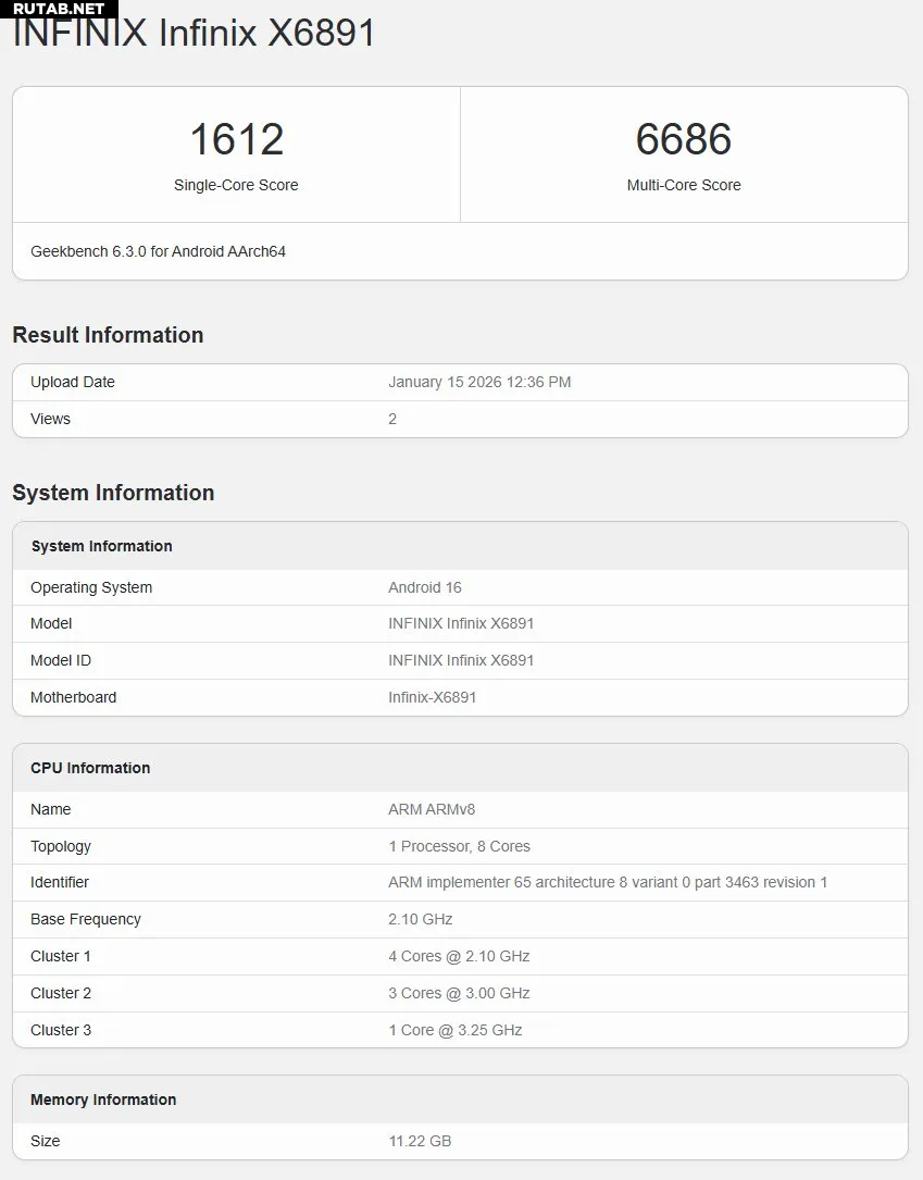 В базе Geekbench появился смартфон с моделью X6891, который, как полагают, и является Infinix GT 50 Pro. Хотя в самом списке название устройства не указано, ранее в базах IMEI этот номер модели уже связывали с GT 50 Pro.