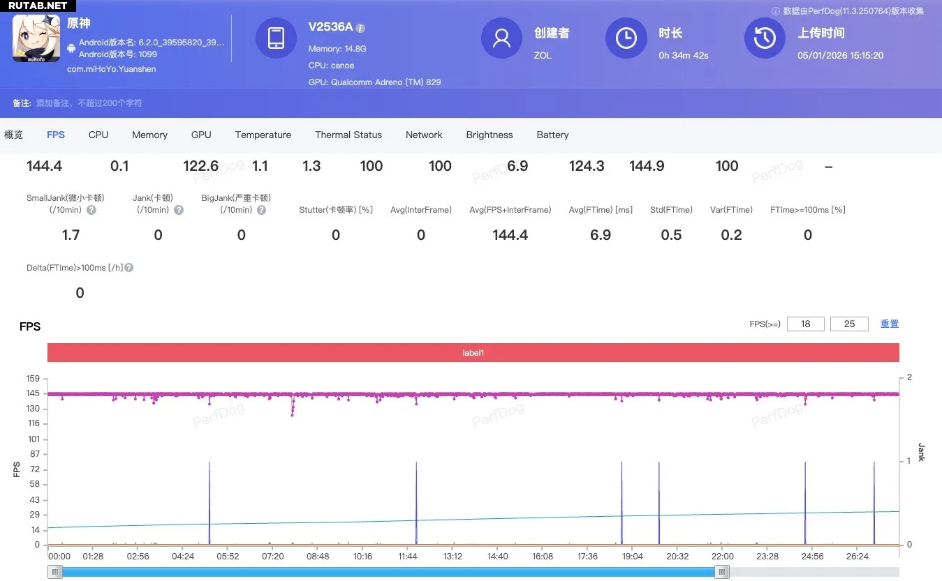 В «Genshin Impact» с включенной функцией Super Frame Rate частота кадров также достигала 144 FPS. В течение получасового теста средний показатель составил 144,4 кадра в секунду. Максимальная температура корпуса после этого теста была зафиксирована на уровне 43,5°C благодаря системе охлаждения Ice Dome с большой площадью испарительной камеры.