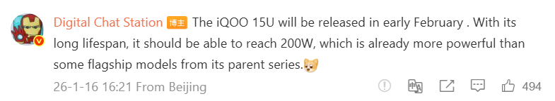 Как уже упоминалось, инсайдер заявляет, что iQOO 15 Ultra дебютирует в Китае в начале февраля. Он предполагает, что в течение жизненного цикла серии устройство может выйти на скорость зарядки до 200 Вт, что поставит его впереди некоторых флагманских моделей материнского бренда (Vivo) с точки зрения возможностей быстрой зарядки.