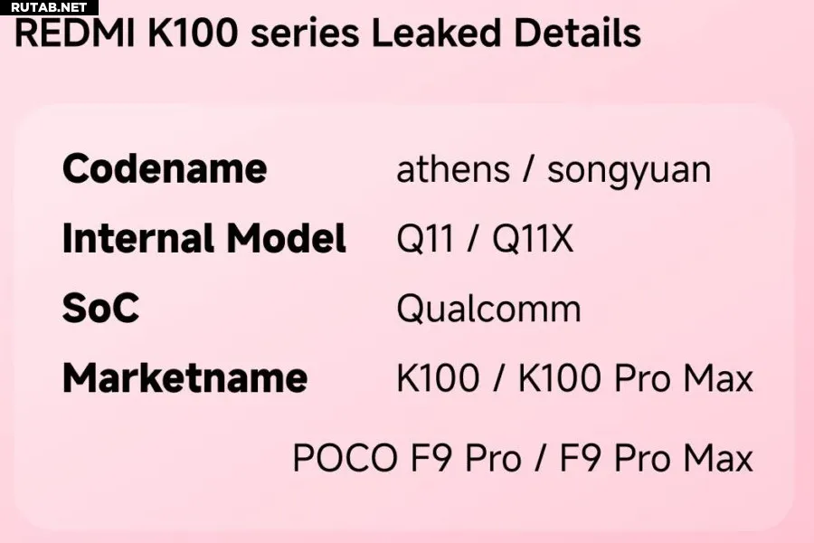 Оба устройства находятся на ранней стадии разработки, но XiaomiTime удалось выяснить их внутренние кодовые имена и номера моделей. Сообщается, что K100 имеет кодовое имя «athens» и внутреннее обозначение Q11, в то время как версия Pro Max, по слухам, носит кодовое имя «songyuan» и обозначение Q11X.