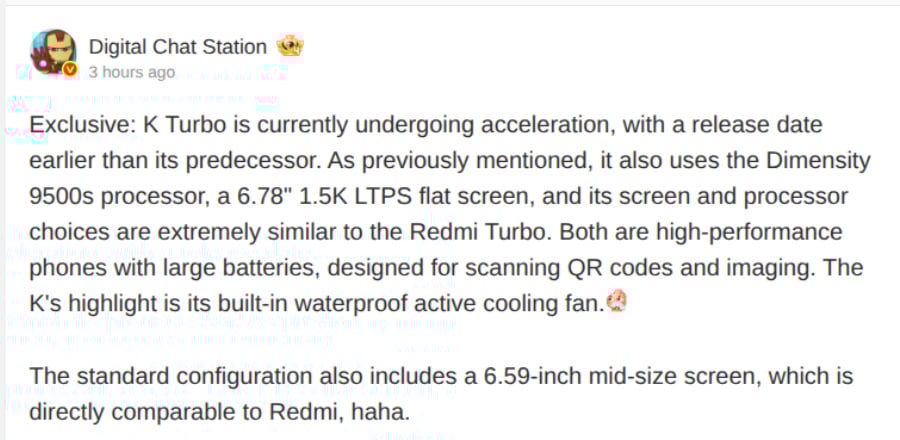 Инсайдер отмечает, что размер экрана и чипсет очень близки к тому, что, как ожидается, предложит Redmi в своём смартфоне Turbo 5 Max. Это говорит о том, что оба «турбо»-телефона будут конкурировать в схожем ценовом сегменте.