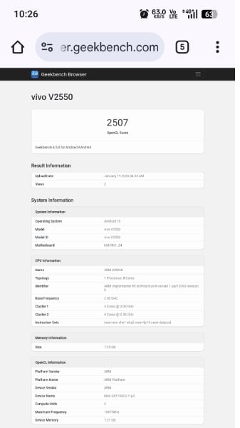 Vivo V70 FE был замечен в базе данных бенчмарка под номером модели V2550. Согласно списку, телефон работает на чипе MediaTek Dimensity 7300 в паре с 8 ГБ оперативной памяти.