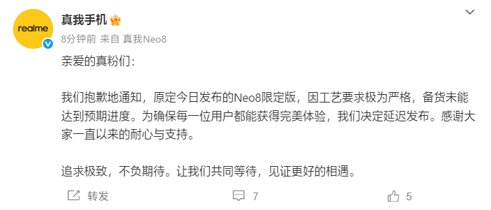 Компания Realme объявила о переносе даты выпуска ограниченной серии смартфона Realme Neo8, созданной в сотрудничестве с музеем Sanxingdui (Саньсиндуй). Изначально релиз был запланирован на 22 января, но был отложен из-за «чрезвычайно строгих технологических требований» и недостаточного количества готовых устройств.