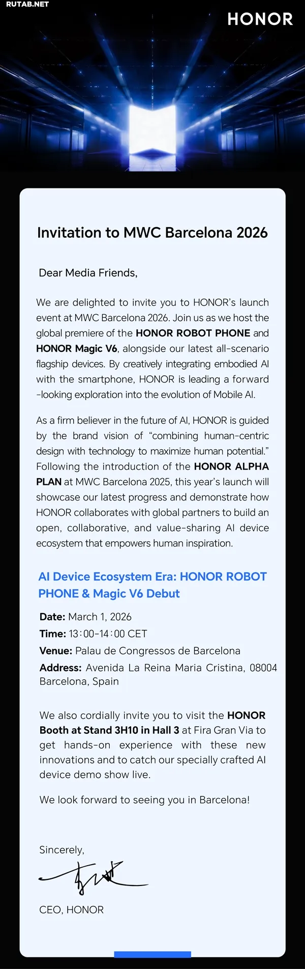 Компания Honor разослала приглашения СМИ, объявив о презентации двух ключевых новинок 2026 года на выставке MWC в Барселоне 1 марта. Речь идёт о флагманском складном смартфоне Honor Magic V6 и инновационном устройстве под названием ROBOT PHONE.