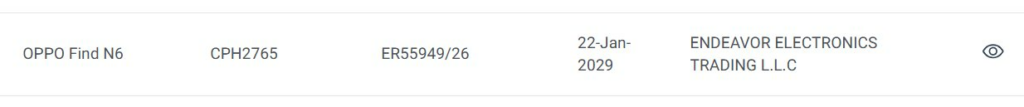 Скриншот показывает, что Oppo Find N6 с номером модели CPH2765 получил одобрение от сертификационного органа TDRA в ОАЭ. Ранее это же устройство было замечено на других платформах — TUV и IMDA.