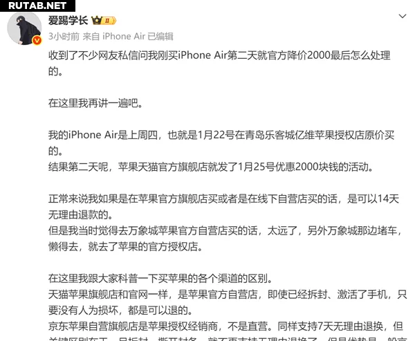 Пользователь купил iPhone Air и на следующий день он подешевел на 2000 юаней