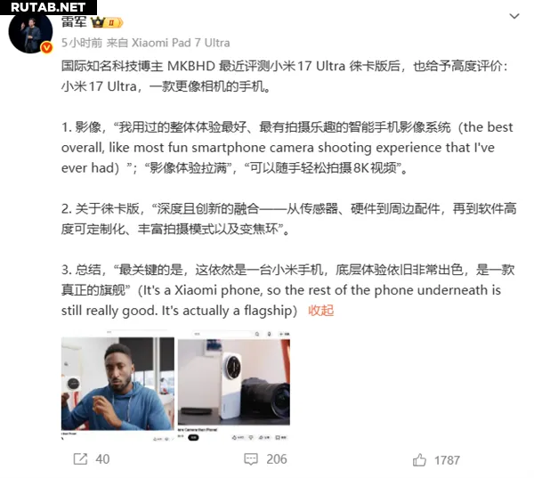 Генеральный директор Xiaomi Лэй Цзюнь сегодня в своём микроблоге поделился мнением известного международного ютубера и обозревателя гаджетов MKBHD о новом флагмане Xiaomi 17 Ultra Leica Edition. Блогер охарактеризовал устройство как «смартфон, который больше похож на камеру».