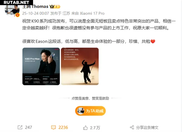 Например, при выходе серии Redmi K90 он поздравил команду с успешным запуском, отметив, что обновление в этом поколении значительное, а цена, учитывая постоянный рост стоимости памяти, весьма справедливая.