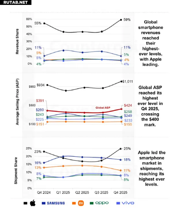 На фоне глобальной тенденции к подорожанию смартфонов средняя розничная цена (ASP) iPhone от Apple в четвёртом квартале 2025 года впервые превысила отметку в 1000 долларов США, достигнув 1011 долларов.