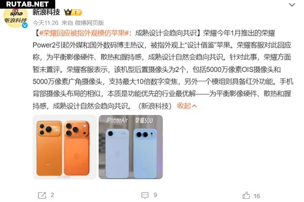 Ранее издание wccftech опубликовало статью, в которой утверждается, что китайские производители смартфонов зачастую совершенно открыто копируют различные элементы дизайна Apple, как внешние, так и программные. Чтобы быть ещё больше похожим на iPhone, Honor Power 2 не только получил схожий оранжевый цвет, но и обзавёлся дополнительным «ложным» объективом в левом нижнем углу блока камер, что делает его визуально похожим на iPhone 17 Pro и iPhone 17 Pro Max.