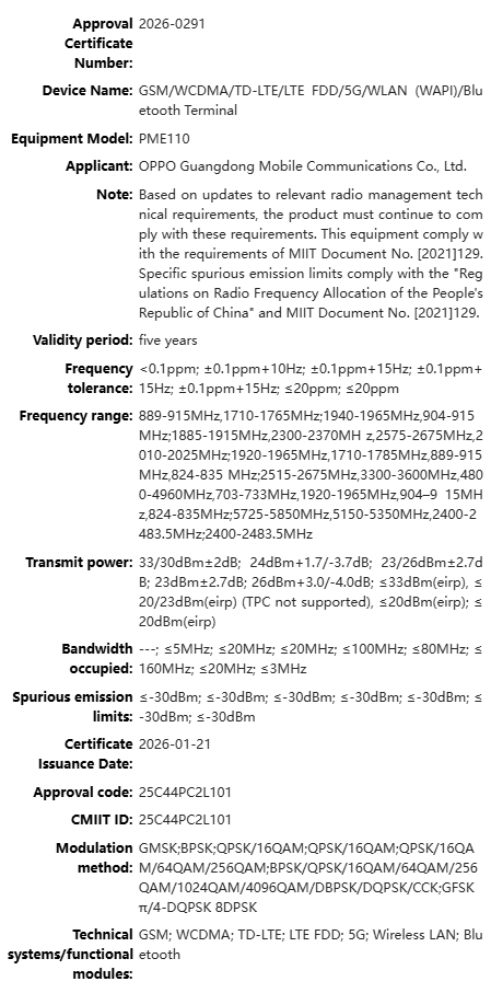 Как видно выше, регулятор SRRC одобрил смартфон Oppo с номером модели PME110, что означает допуск его функций беспроводной и радиосвязи в Китае. Однако устройству всё ещё предстоит получить сертификаты 3C и TENAA, прежде чем оно приблизится к официальному запуску.