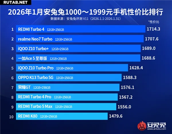 Новый смартфон Redmi Turbo 5 Max, вышедший на рынок в начале 2026 года, оказался в невыгодном положении в рейтинге AnTuTu по соотношению цены и производительности. Несмотря на стартовую цену чуть выше 1800 юаней, устройство заняло лишь девятое место.