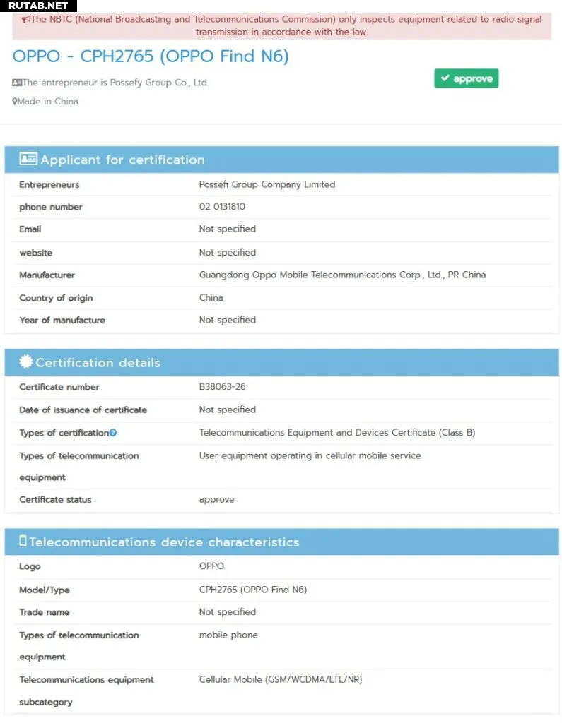 Oppo Find N6 была сертифицирована Национальной комиссией по телерадиовещанию и телекоммуникациям Таиланда (NBTC) под номером модели CPH2765. Как и в большинстве записей NBTC, технические характеристики не раскрываются, но одобрение подтверждает Таиланд в качестве ещё одного рынка для складного устройства.