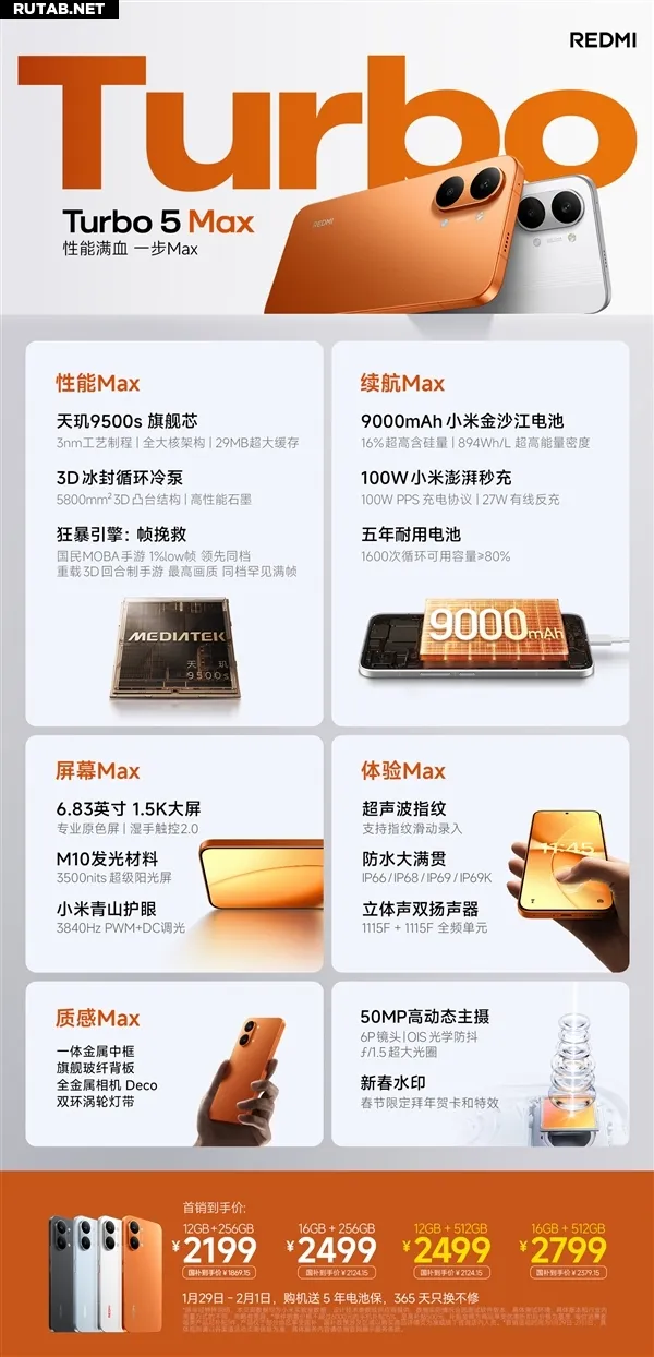 Redmi Turbo 5 Max позиционируется как производительный аппарат. Он стал первым в мире смартфоном на флагманском процессоре MediaTek Dimensity 9500s, изготовленном по 3-нм техпроцессу TSMC. Чипсет показал результат свыше 3,61 миллиона баллов в бенчмарке AnTuTu.