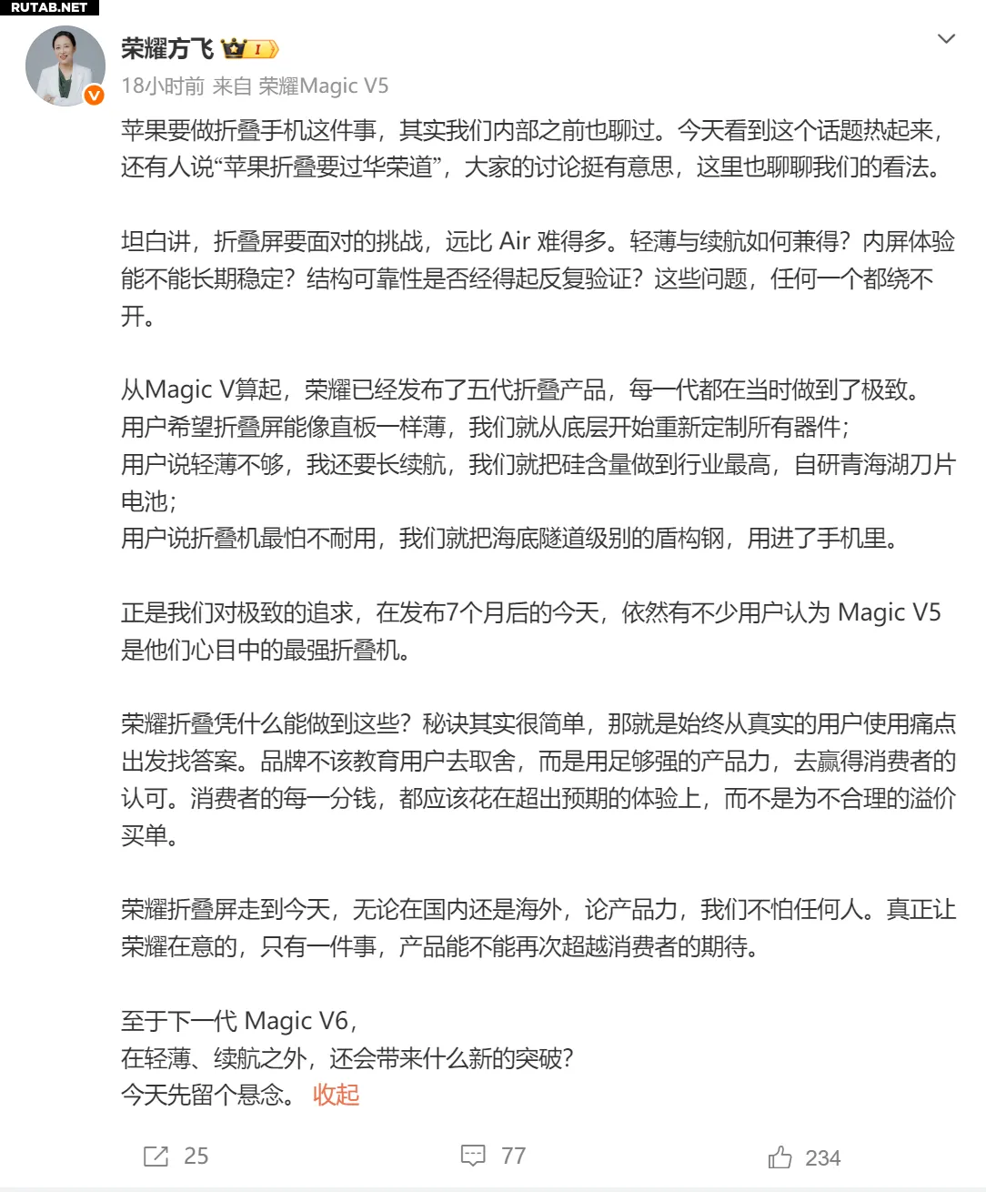 Президент продуктовой линейки компании Honor Фан Фэй в своём микроблоге прокомментировала слухи о том, что Apple может выпустить складной смартфон.