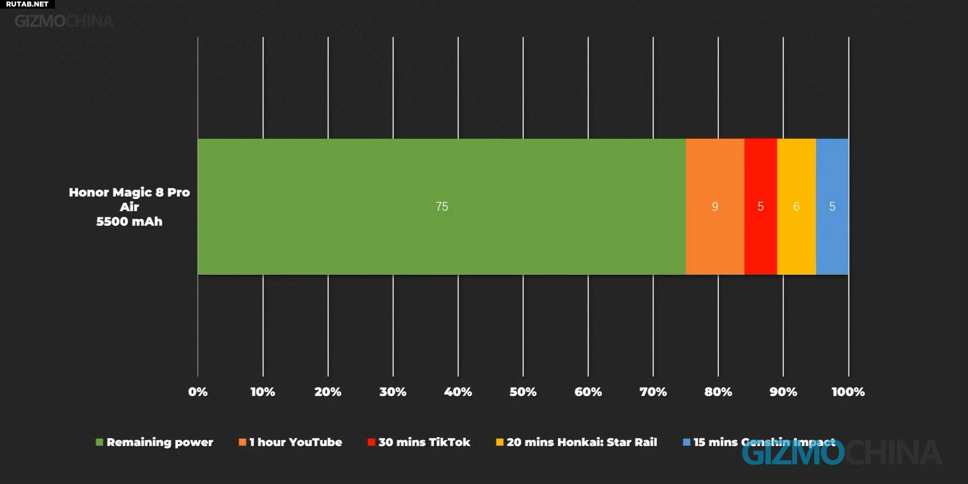 Экран хорошо оптимизирован с точки зрения энергопотребления. В сочетании с большой батареей это обеспечивает отличную автономность: 15 минут игры в Honkai: Star Rail расходуют около 6% заряда, 20 минут Genshin Impact — около 5%.