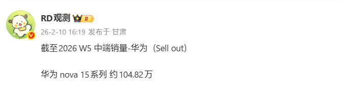По данным инсайдера «RD Observation», совокупные продажи смартфонов серии Huawei nova 15 по состоянию на пятую неделю 2026 года превысили один миллион единиц, достигнув отметки в 1,0482 миллиона штук.