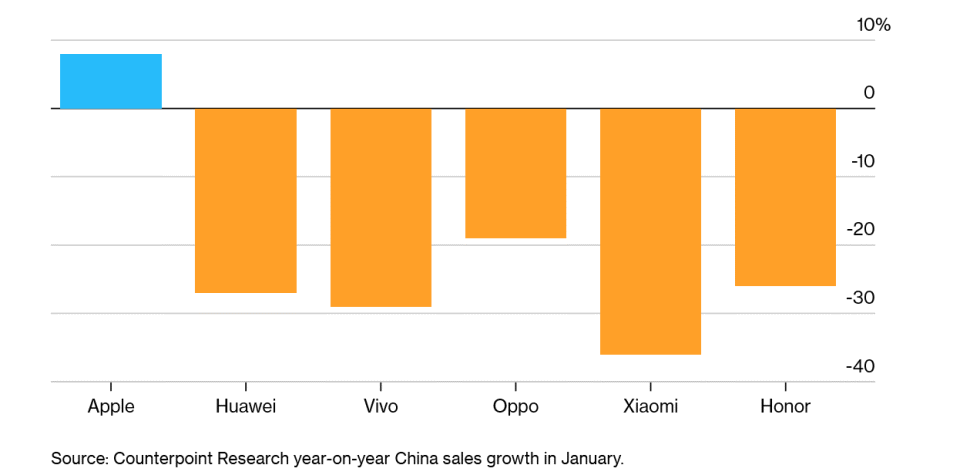 Apple стала единственным брендом с ростом продаж на китайском рынке смартфонов в январе