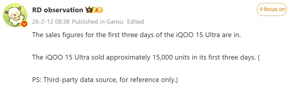 Флагманский смартфон iQOO 15 Ultra, представленный в Китае в начале февраля, вызвал значительный интерес у покупателей. Согласно данным инсайдеров, за первые три дня после старта продаж было отгружено около 15 000 устройств, а первая партия на маркетплейсе JD.com была полностью распродана.