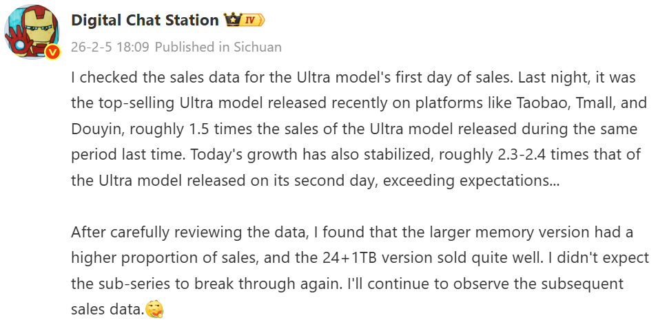 По информации блогера Digital Chat Station, продажи новой Ultra-модели превзошли ожидания. На платформе JD.com новинка показала результат примерно в 1,5 раза выше, чем у предыдущей Pro-модели за аналогичный период. К третьему дню темпы роста продаж достигли 2,3–2,4 раза по сравнению с показателями второго дня продаж предшественника. Особый интерес покупатели проявили к версии с максимальным объёмом памяти 24 ГБ + 1 ТБ.