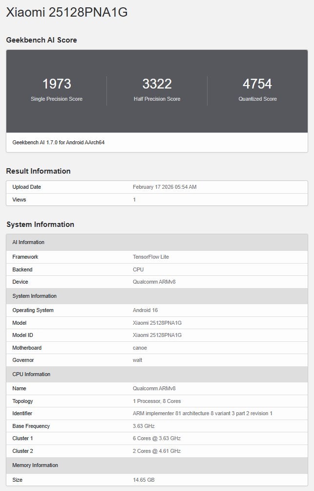 Бенчмарк также подтверждает наличие чипсета Qualcomm на архитектуре ARMv8 с шестью энергоэффективными ядрами с частотой 3,63 ГГц и двумя производительными ядрами, разогнанными до 4,61 ГГц. Это соответствует ожиданиям от процессора Snapdragon 8 Elite Gen 5. Устройство также фигурирует с 16 ГБ оперативной памяти и операционной системой Android 16, вероятно, под управлением интерфейса HyperOS 3 от Xiaomi. Появление в Geekbench говорит о том, что тестирование устройства уже идет в преддверии его международного релиза.