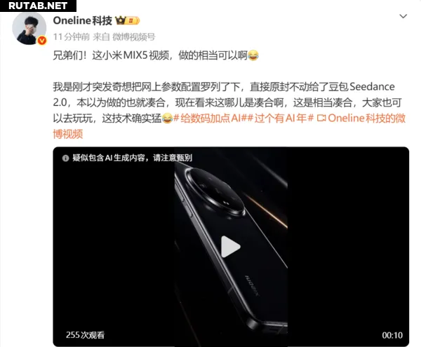 Цифровой блогер Oneline Technology использовал ИИ-инструмент Doubao Seedance 2.0 для создания видеоролика с концептуальным рендерингом будущего флагмана Xiaomi MIX 5.