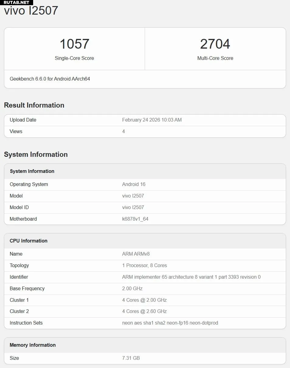 Устройство с моделью I2507, согласно данным бенчмарка, будет работать на чипсете MediaTek Dimensity 7400. Прямого названия в списке нет, но конфигурация CPU и данные о GPU, доступные через метаданные, однозначно указывают на D7400. Тест также показывает наличие 8 ГБ оперативной памяти и операционную систему Android 16. Результаты в 1057 баллов в однопоточном и 2507 баллов в многопоточном тесте соответствуют типичной производительности этого чипа.
