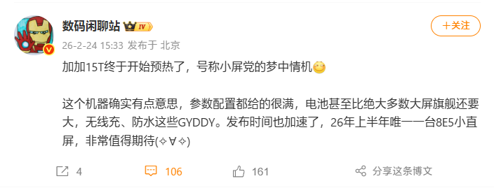 «Это смартфон с лучшим пользовательским опытом среди компактных моделей. Сохраняя эталонный уровень производительности и автономности, он совершил всесторонний скачок в плане плавности системы, игровой производительности, возможностей камеры, качества экрана и скорости зарядки. Команда проекта все еще занимается финальной оптимизацией деталей, чтобы выпустить по-настоящему достойный продукт. Я верю, что это будет Dream Phone, которого так долго ждали пользователи компактных смартфонов».