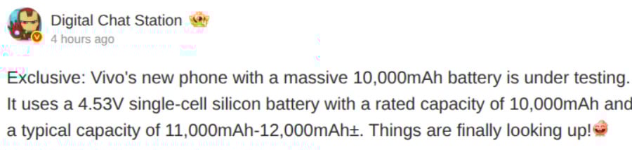 В отдельном комментарии блогер ответил на вопрос, могут ли флагманские телефоны Vivo в этом году достичь 9 000 мАч. По словам Digital Chat Station, основная флагманская линейка вряд ли выйдет на этот уровень, но телефоны суббренда iQOO могут получить элемент на 9 000 мАч.