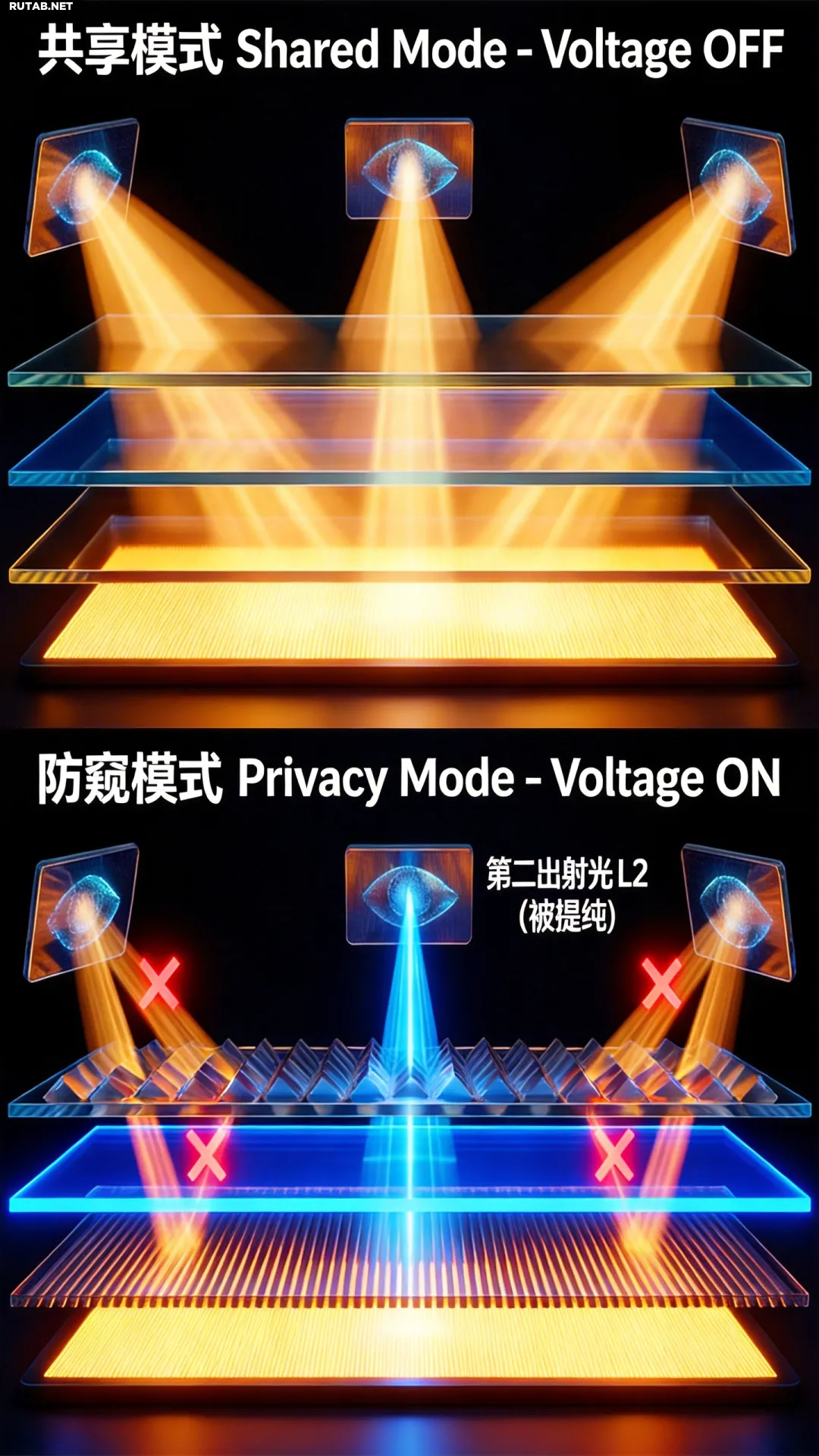 Судя по всему, в этом режиме используется не просто отключение пикселей, а дополнительный микроскопический слой, похожий на светофильтр. С помощью напряжения меняется ориентация жидких кристаллов, и свет, идущий под углом, перенаправляется и рассеивается внутри экрана.