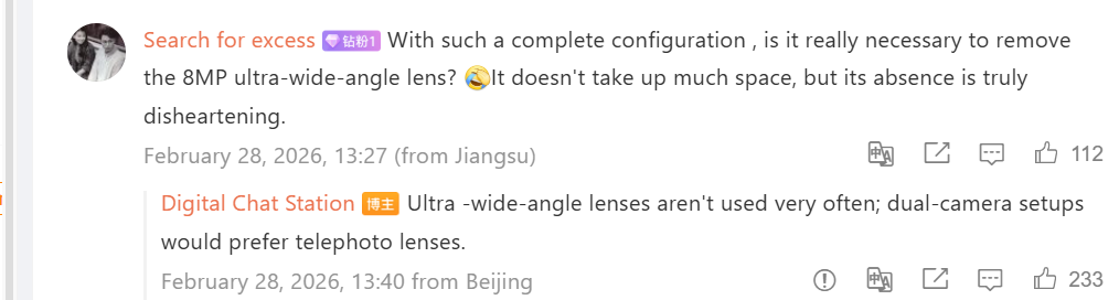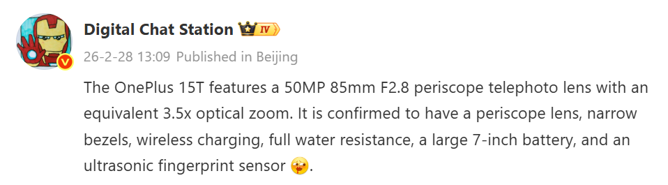 Известный инсайдер DCS заявил, что OnePlus 15T получит 50-мегапиксельный перископный объектив 85mm f/2.8 с подтверждённым оптическим зумом. Он также упомянул узкие рамки экрана, беспроводную зарядку, полноценную защиту от воды, аккумулятор, ёмкость которого начинается с цифры 7, и ультразвуковой сканер отпечатков пальцев. В комментариях к своему посту в Weibo DCS отметил, что сверхширокоугольные камеры имеют относительно низкую частоту использования, и он бы предпочёл двойную камеру, сфокусированную на телефото. Это намекает, что OnePlus 15T, как и прошлогодний OnePlus 13T, может обойтись без сверхширокоугольного объектива.